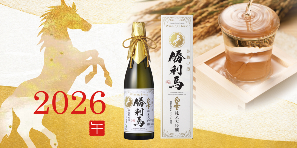 来年2026年(令和8年)の干支は午(うま)です。馬の力強く大地を駆ける姿から、「飛躍」や「前進」の象徴とされ、エネルギーに満ちた年になるといわれています。また年のはじめに白い馬を見ると、一年の邪気を祓い「無病息災」に過ごせるといわれています。お正月の縁起物として、また新年のご挨拶や贈答品として、「勝利馬」はいかがでしょうか。ラベルには来年の干支「午」をデザインしています。縁起の良い華やかなデザインが、新しい年に彩りを添えます。