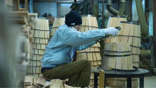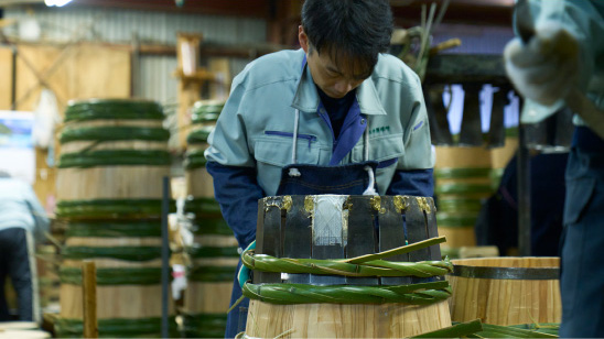 ふだんの酒造りにはみられない、様々な手によって支えられていることも、樽酒ならではといえるでしょう。杉の木を伐り倒す。樽材に加工する。樽を組み上げる。菰(こも)を巻く。その一つひとつの工程において、いまなお受け継がれる職人技。樽酒を楽しむことは、そうした貴重な技術の伝承とも深く関わっているのです。